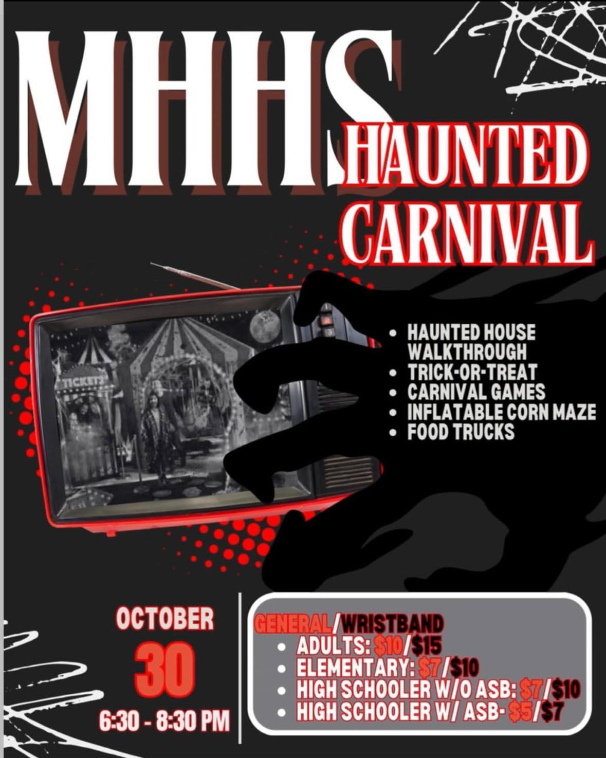 Join us for the MHHS Annual Haunted Carnival on Thursday, October 30th from 6:30PM–8:30PM! Come enjoy a spooky night full of fun — walk through the Haunted House, Trick-or-Treat, grab a bite from Food Trucks, and explore tons of thrilling activities!