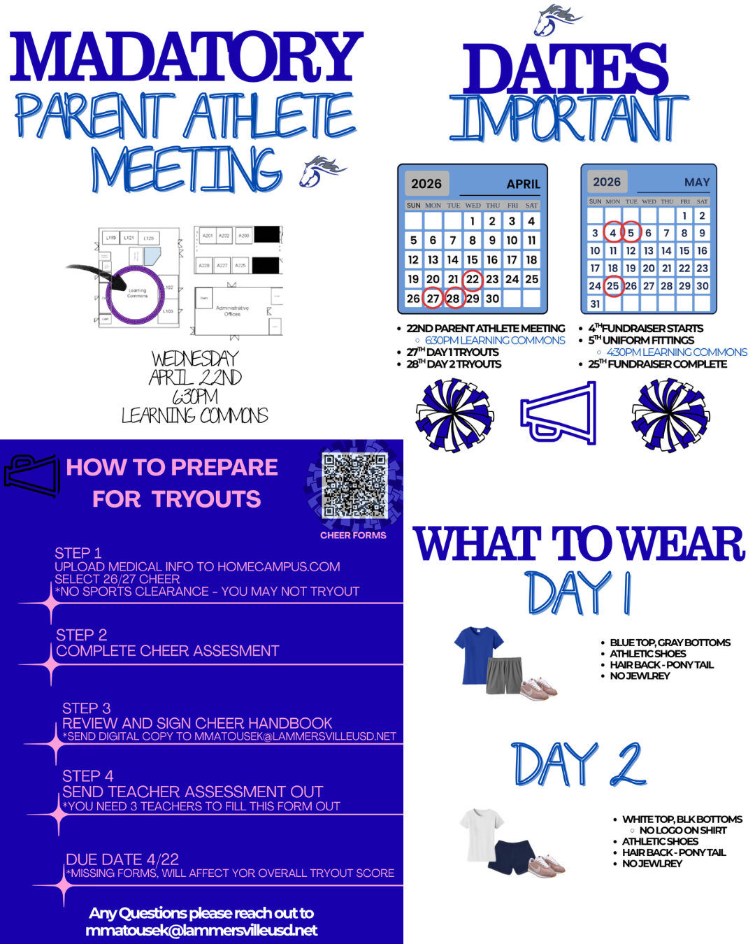 Want to represent MHHS on the sidelines? Your journey to the squad starts NOW! Grab a parent and meet us for the Mandatory Cheers Tryouts Meeting.